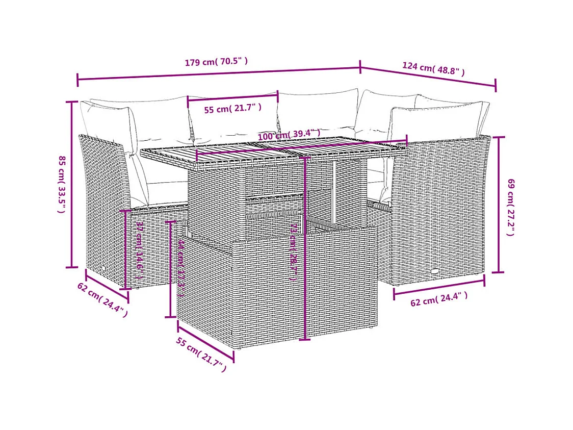 5 pcs conjunto de sofás p/ jardim com almofadões vime PE bege PT655208