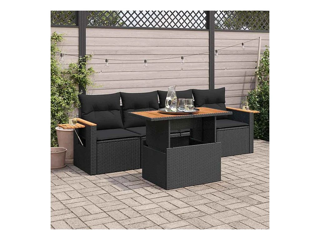 5 pcs conjunto de jantar p/ jardim c/ almofadões vime PE preto
