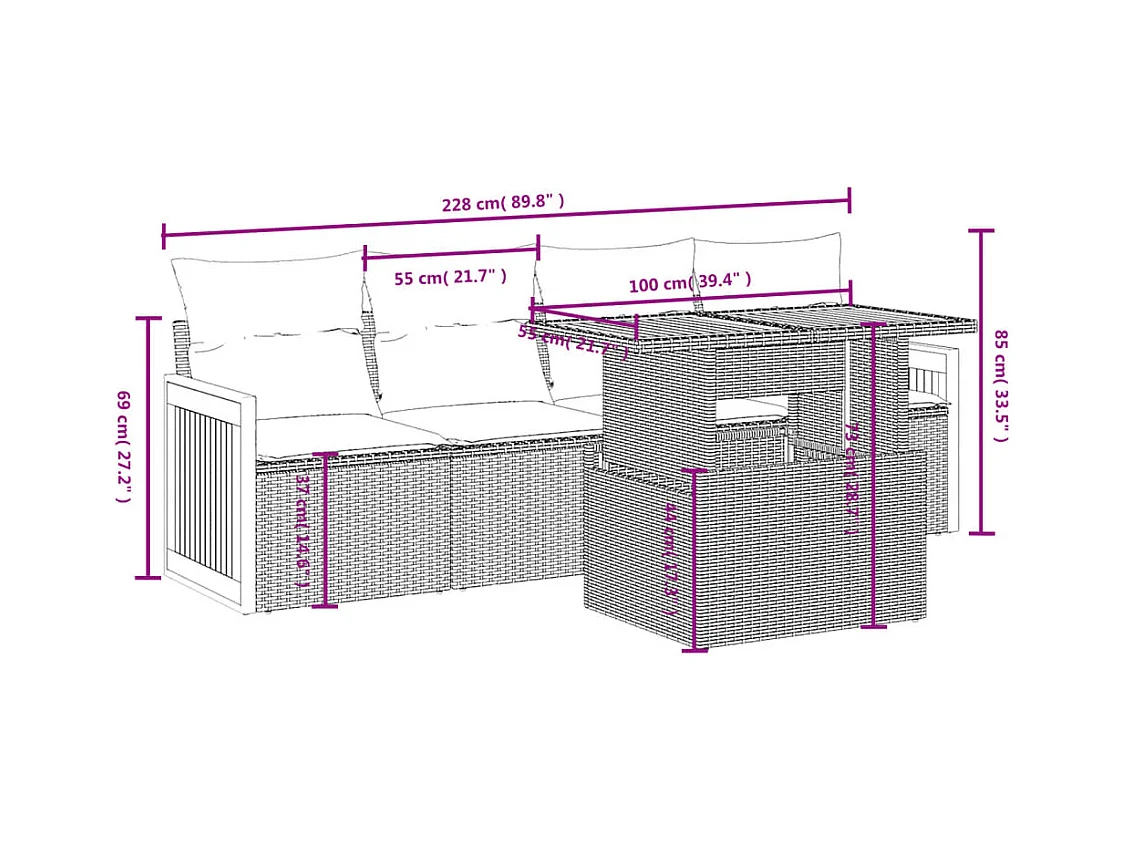 5 pcs conjunto sofás de jardim com almofadões vime PE preto PT449807