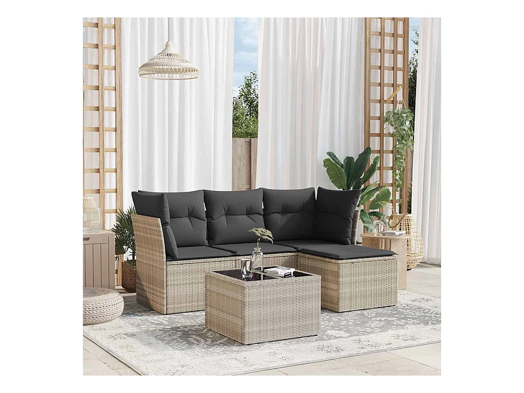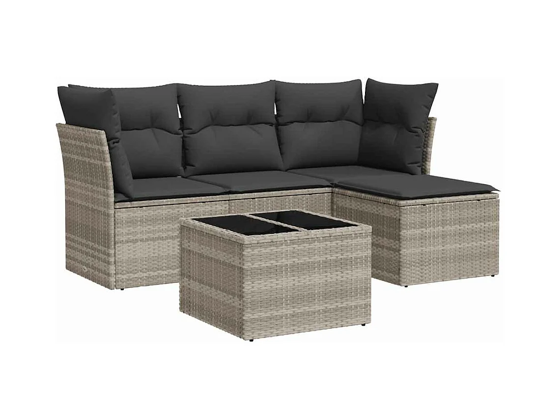 5 peças conj. sofás jardim com almofadões vime PE cinzento-claro