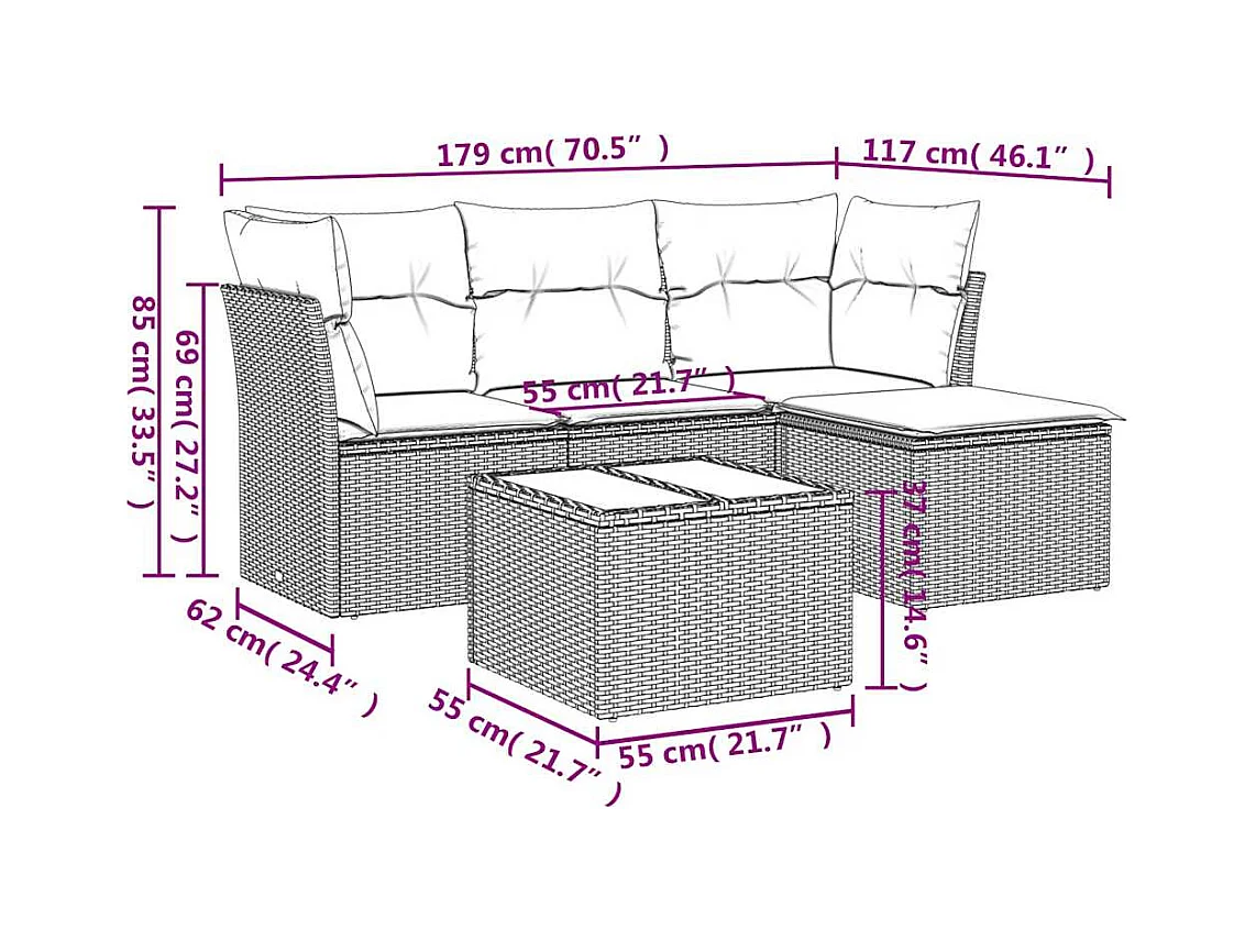 5 peças conjunto sofás de jardim com almofadões vime PE cinzento
