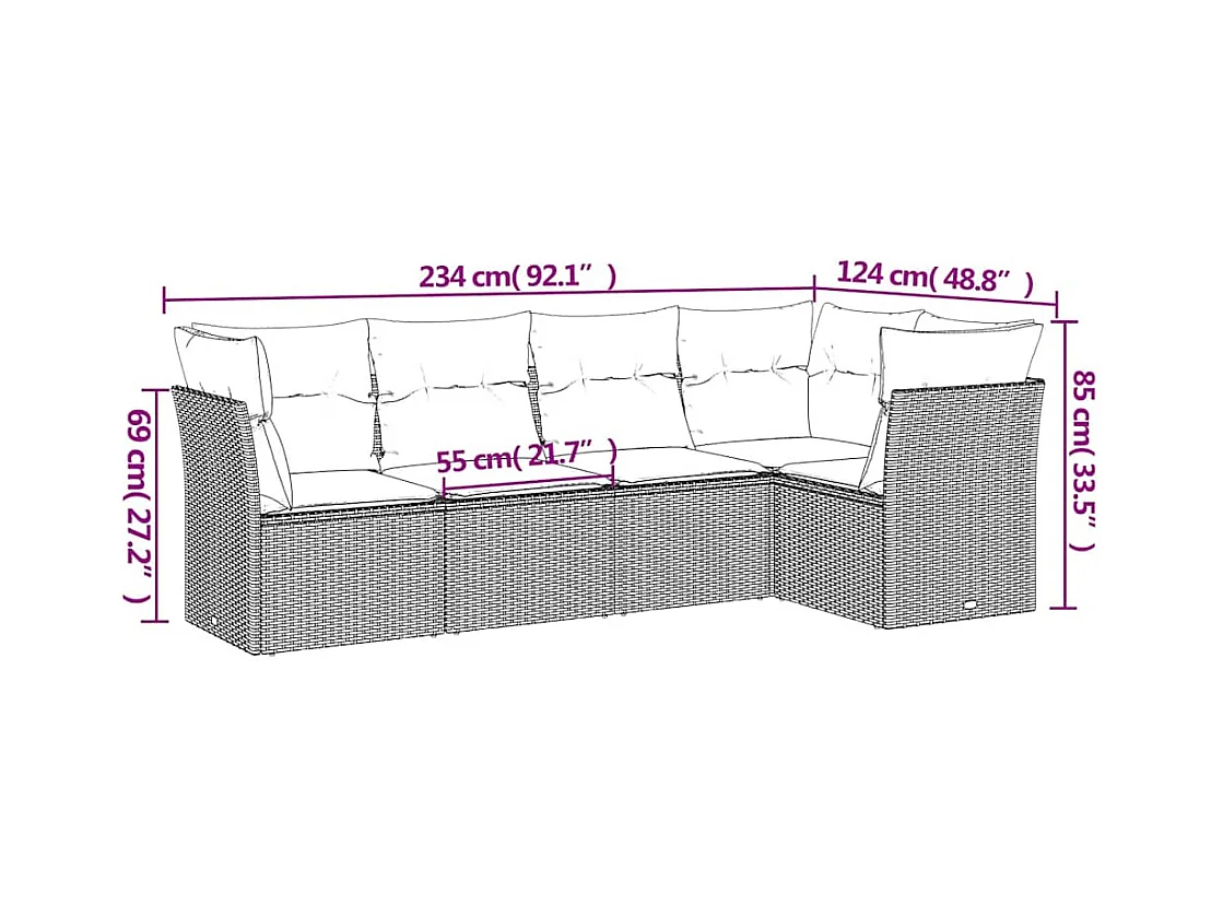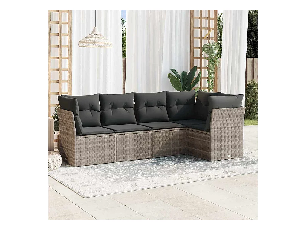 5 peças conj. sofás jardim com almofadões vime PE cinzento-claro