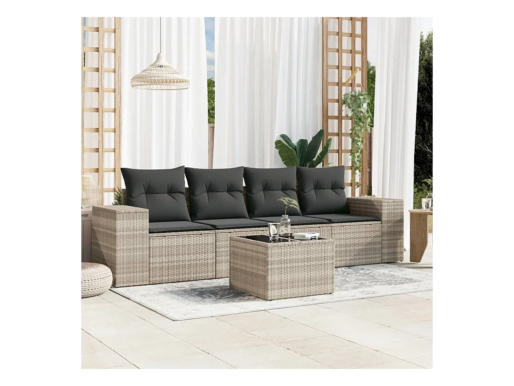 5 peças conj. sofás jardim com almofadões vime PE cinzento-claro
