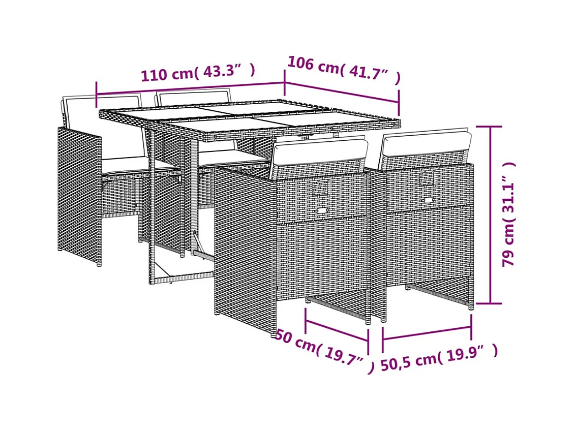 5 peças conj. jantar jardim com almofadões vime PE bege misturado