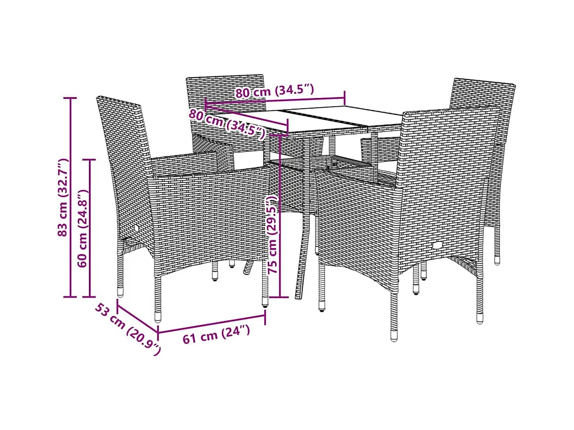 5 peças conjunto jantar jardim com almofadões vime PE/vidro cinza