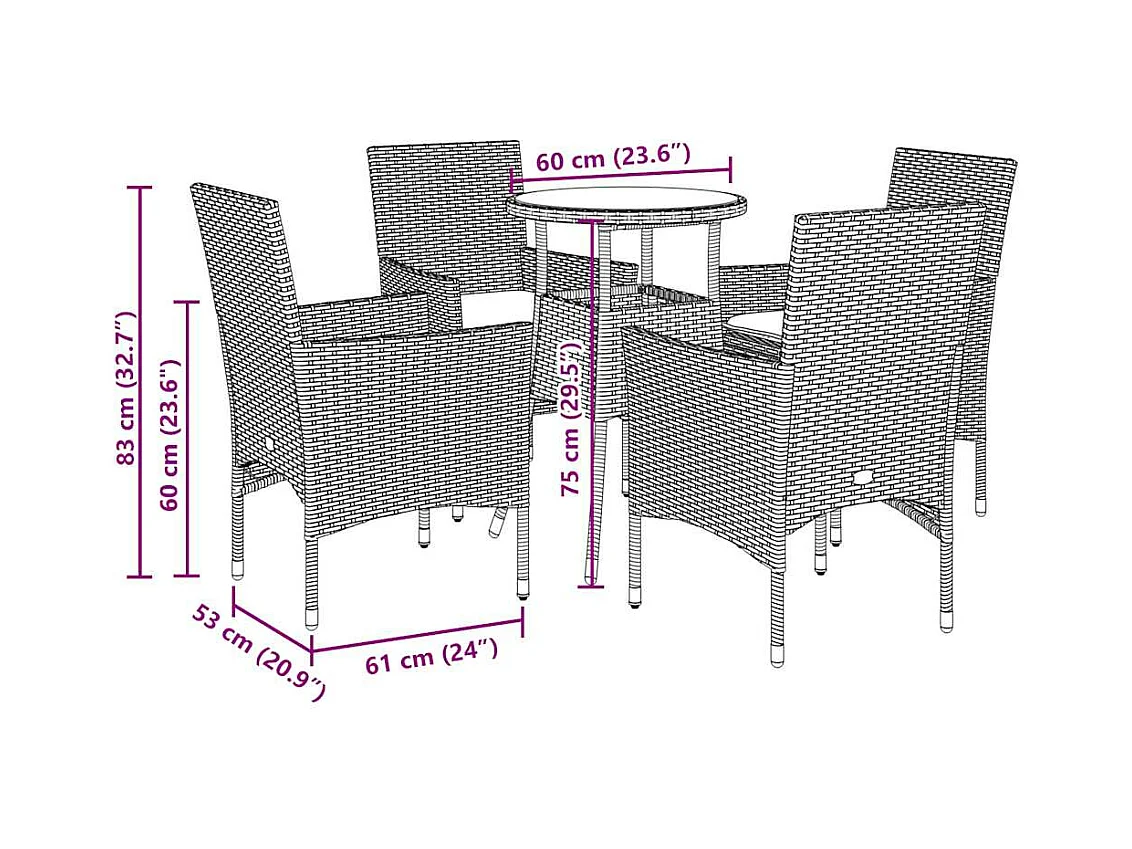 5 pcs conjunto jantar jardim c/ almofadões vime PE/vidro preto PT116485
