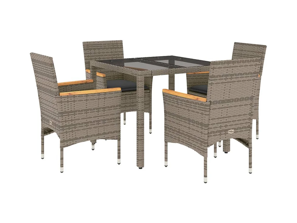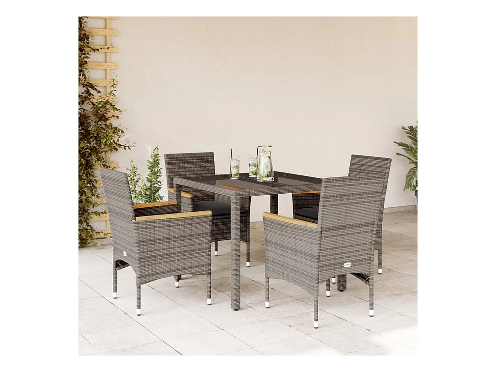 5 peças conjunto jantar jardim com almofadões vime PE/acácia cinza