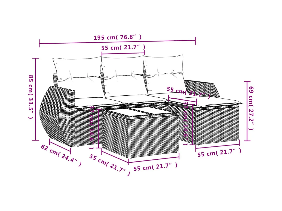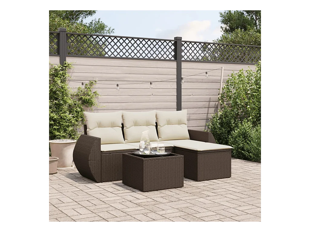 4 peças conjunto lounge jardim c/ almofadões vime PE castanho