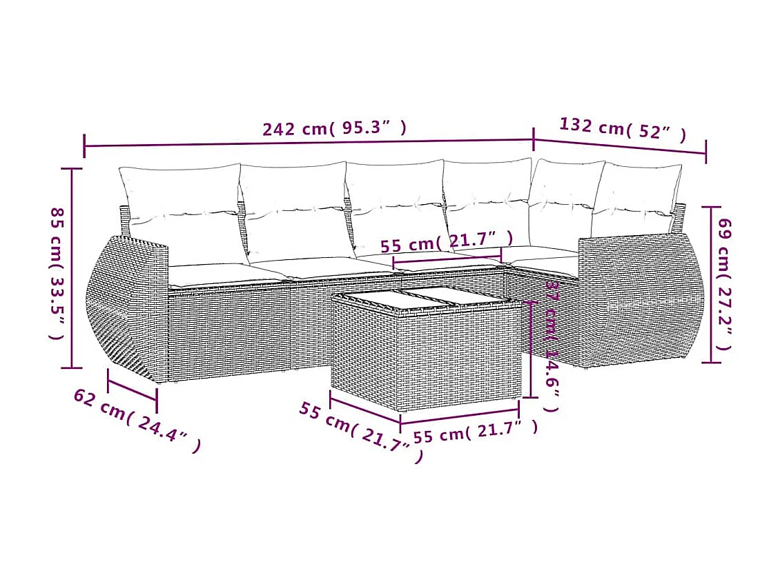 6 pcs conj. sofás jardim com almofadões vime PE cinzento-claro