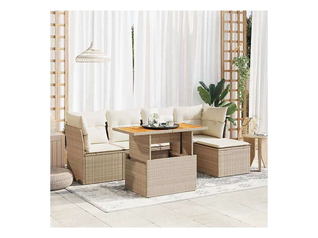 6 pcs conjunto sofás jardim com almofadões vime PE/acácia bege
