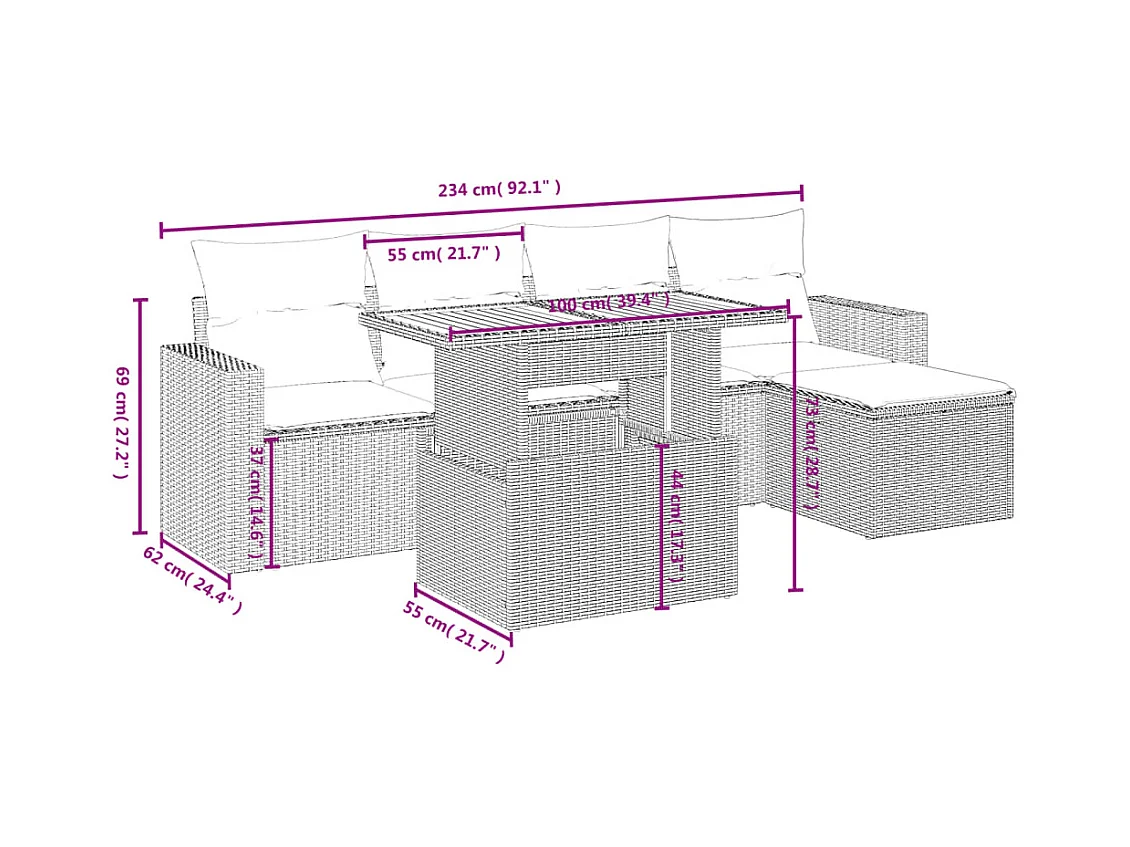 6 pcs conjunto de sofás p/ jardim com almofadões vime PE bege