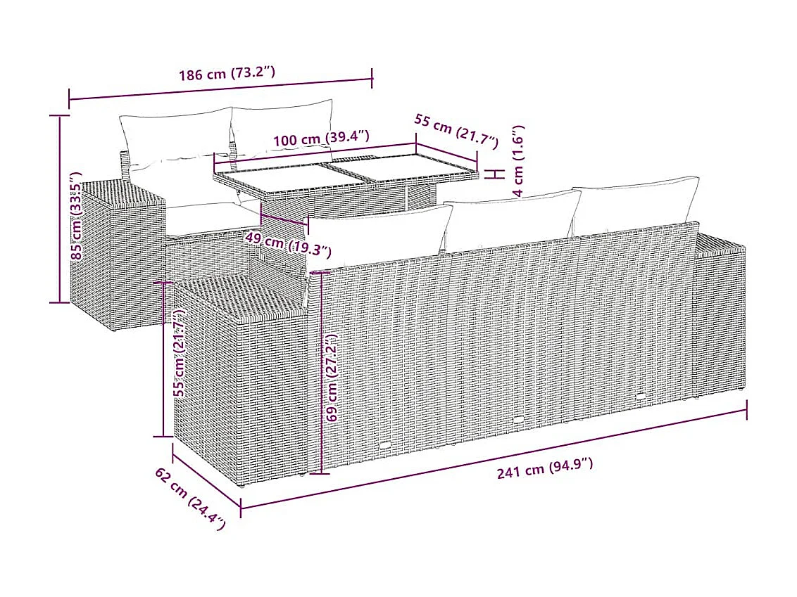 6 pcs conjunto de sofás p/ jardim com almofadões vime PE bege