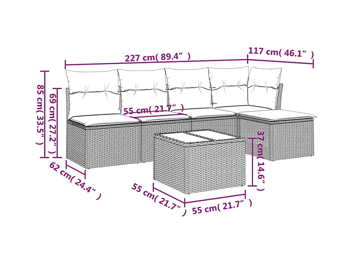 6 pcs conjunto de sofás p/ jardim com almofadões vime PE bege PT169890