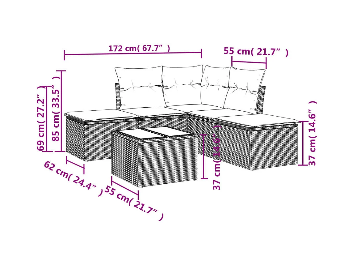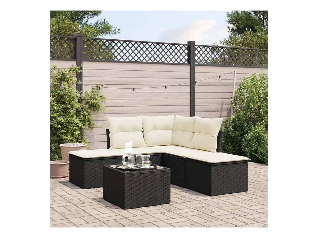 5 pcs conjunto sofás de jardim com almofadões vime PE preto