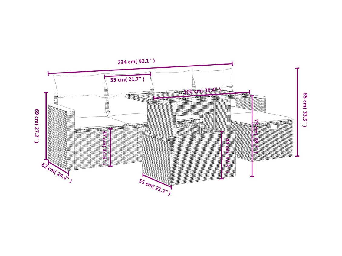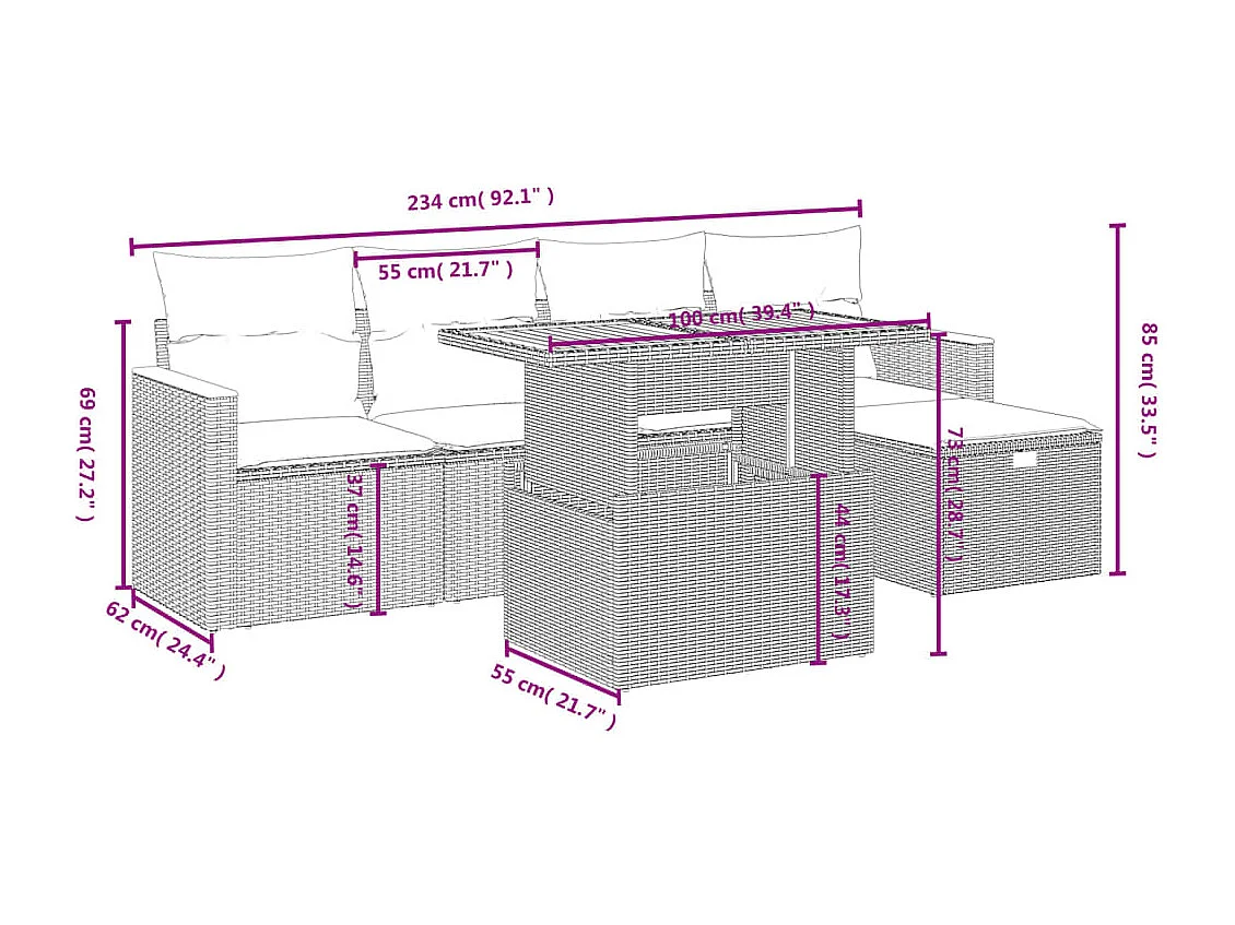 6 pcs conjunto sofás de jardim c/ almofadões vime PE preto