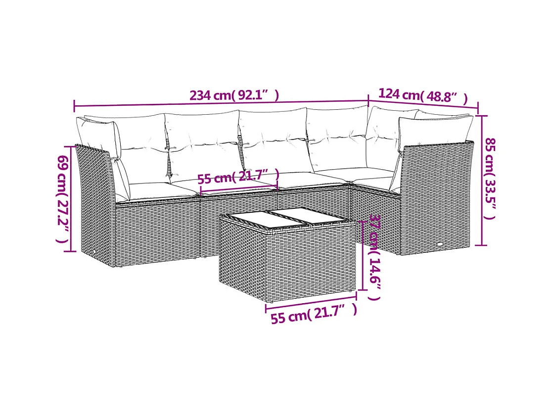 6 pcs conjunto sofás de jardim c/ almofadões vime PE preto PT989490