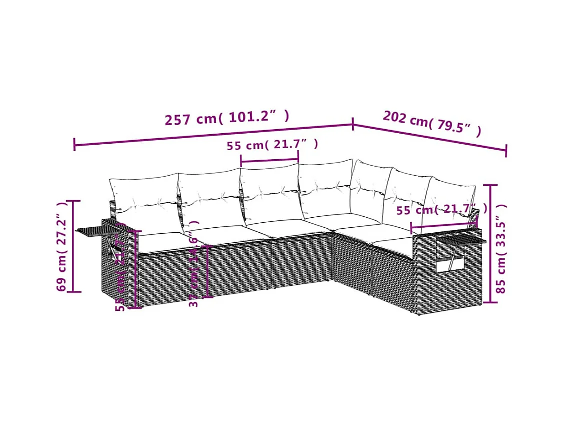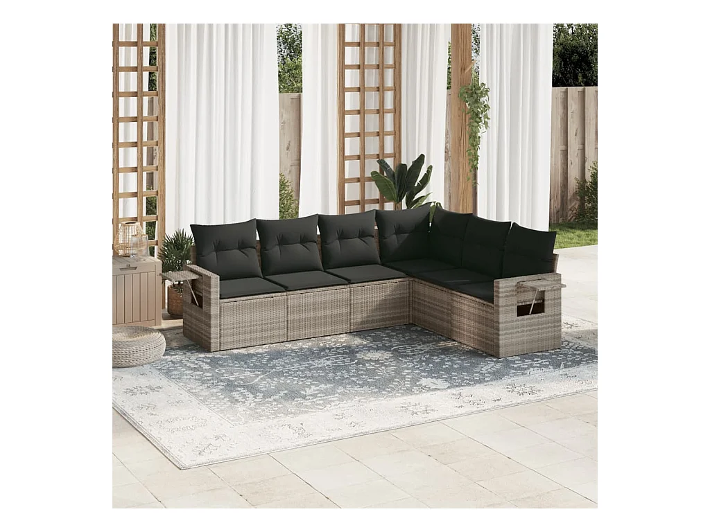 6 peças conj. sofás jardim com almofadões vime PE cinzento-claro