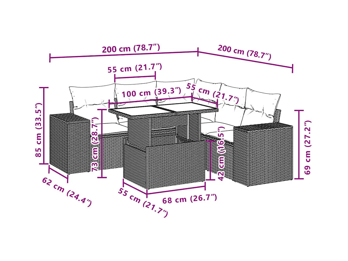6 peças conjunto de sofás para jardim com almofadões vime PE bege