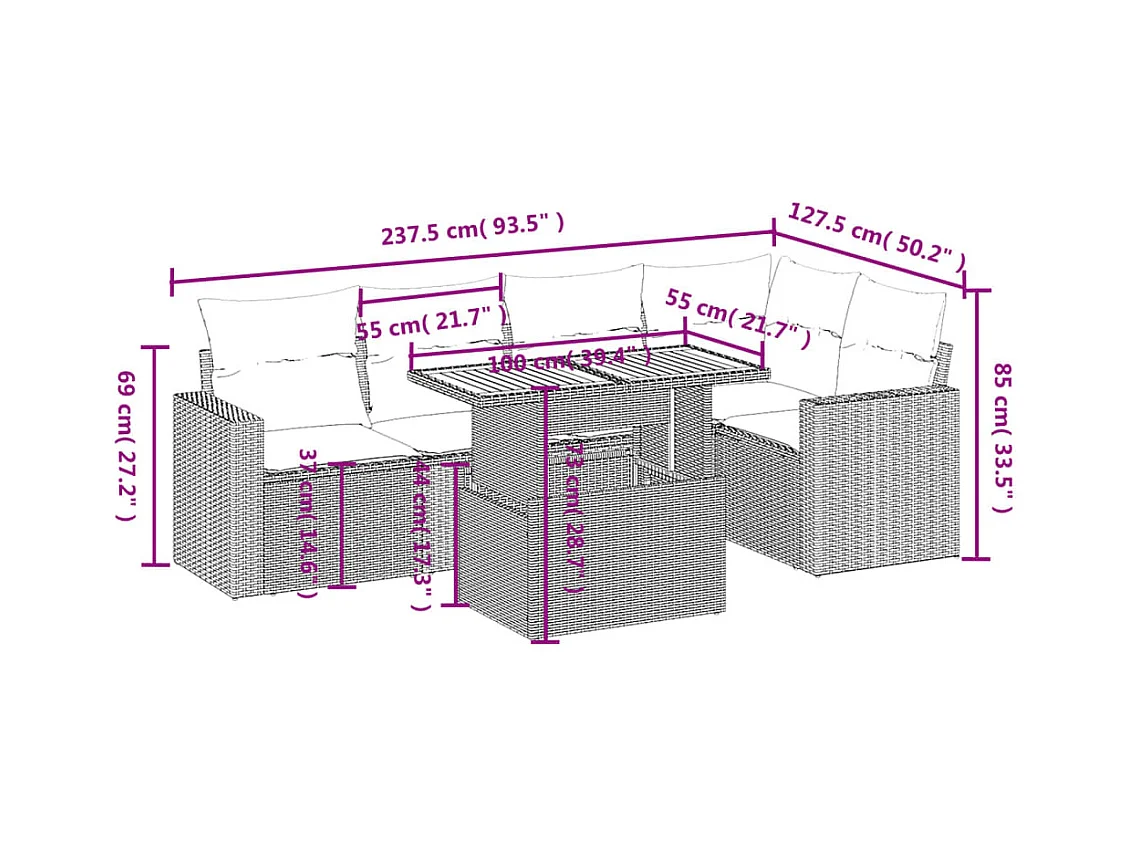 5 peças conjunto de sofás para jardim com almofadões vime PE bege