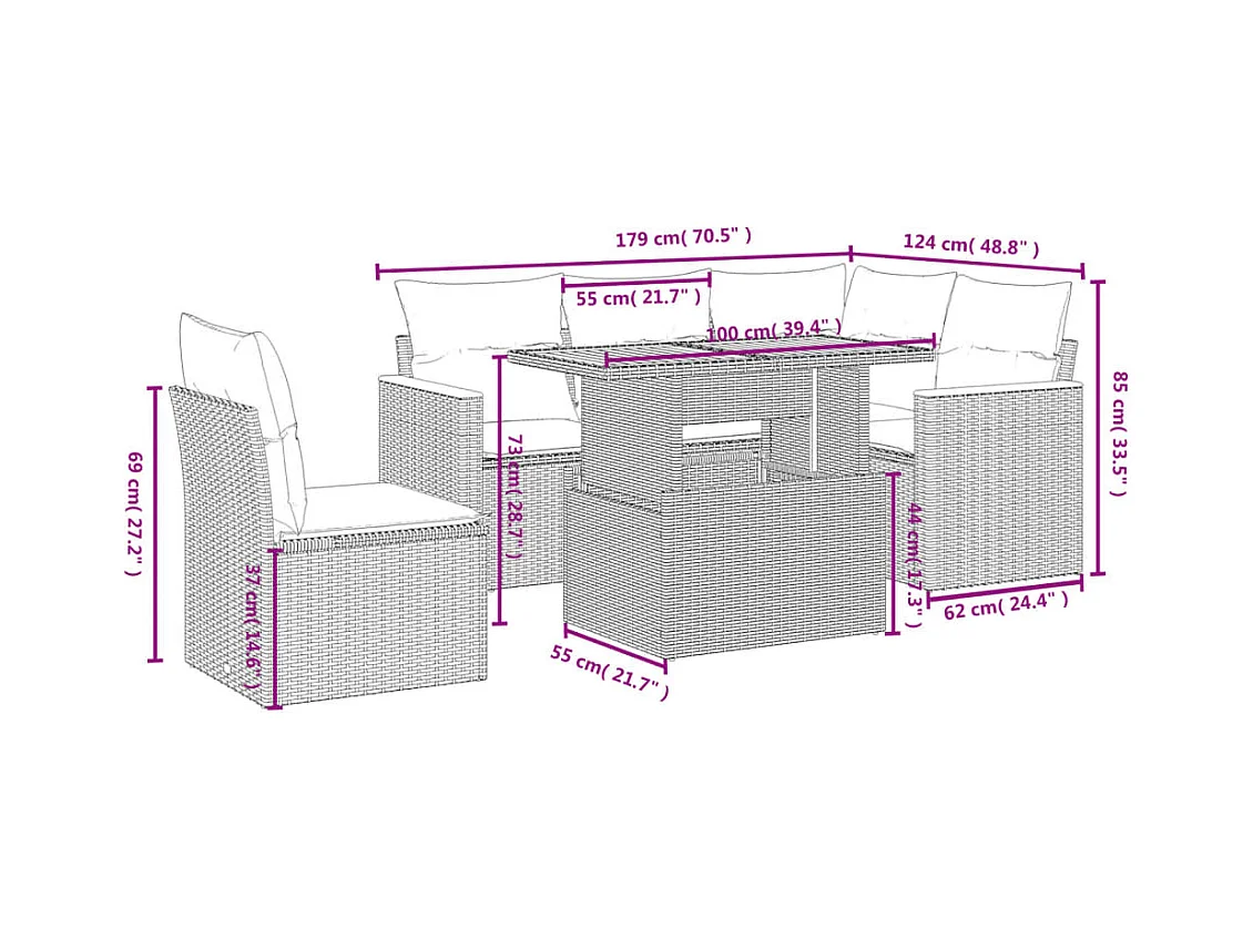 5 peças conjunto de sofás para jardim com almofadões vime PE bege