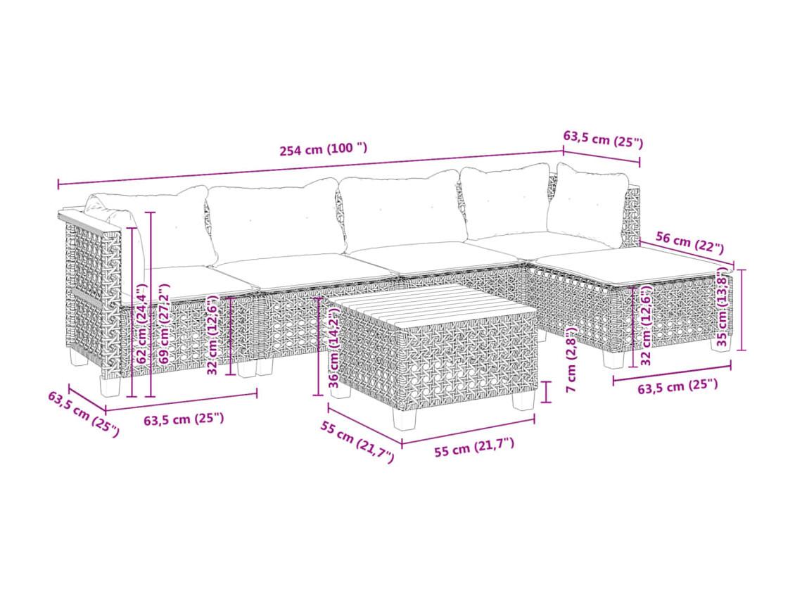 6 peças conjunto sofás de jardim com almofadões vime cinzento