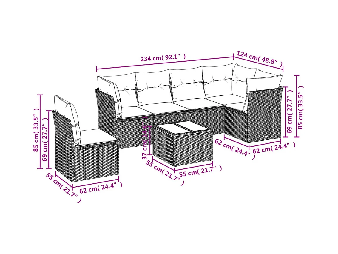 7 pcs conjunto sofás p/ jardim c/ almofadões vime PE cinzento