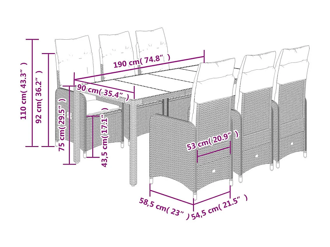 9 pcs conjunto bistrô de jardim c/ almofadões vime PE cinzento
