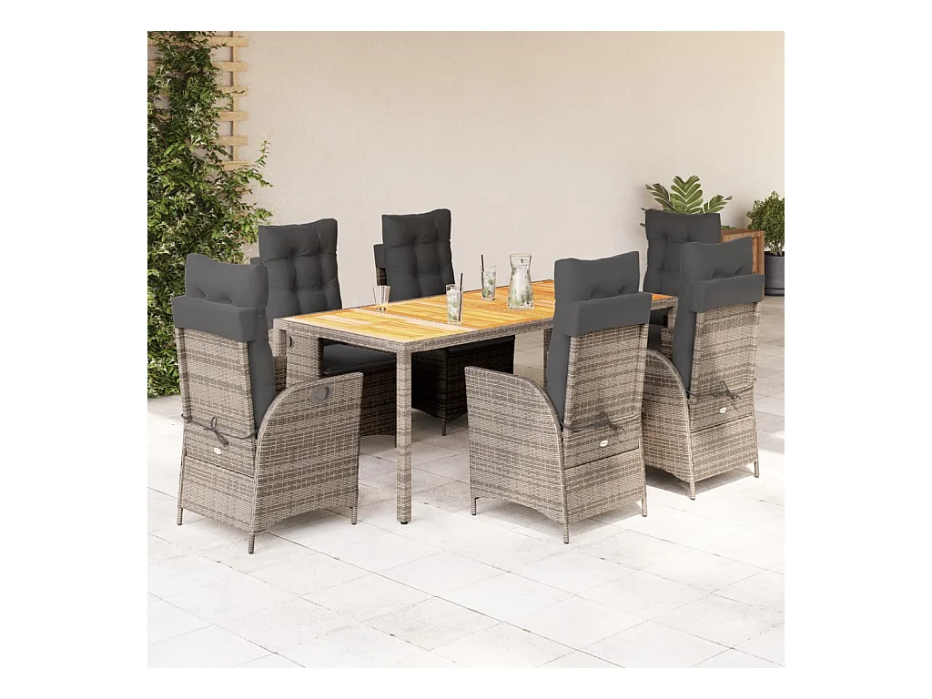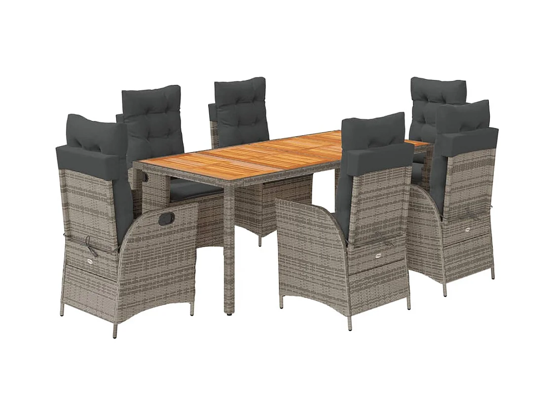 7 pcs conjunto jantar jardim c/ almofadões vime PE/acácia cinza