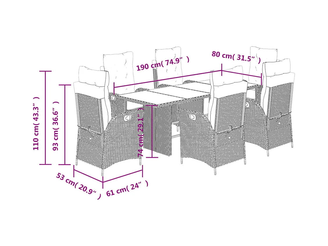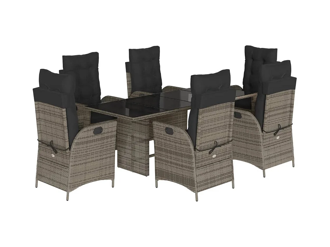 7 pcs conjunto de jantar p/ jardim c/ almofadões vime PE cinza