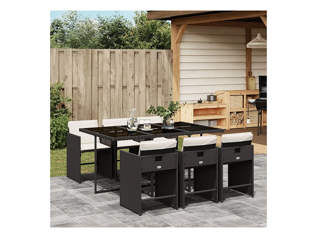 7 pcs conjunto de jantar p/ jardim c/ almofadões vime PE preto