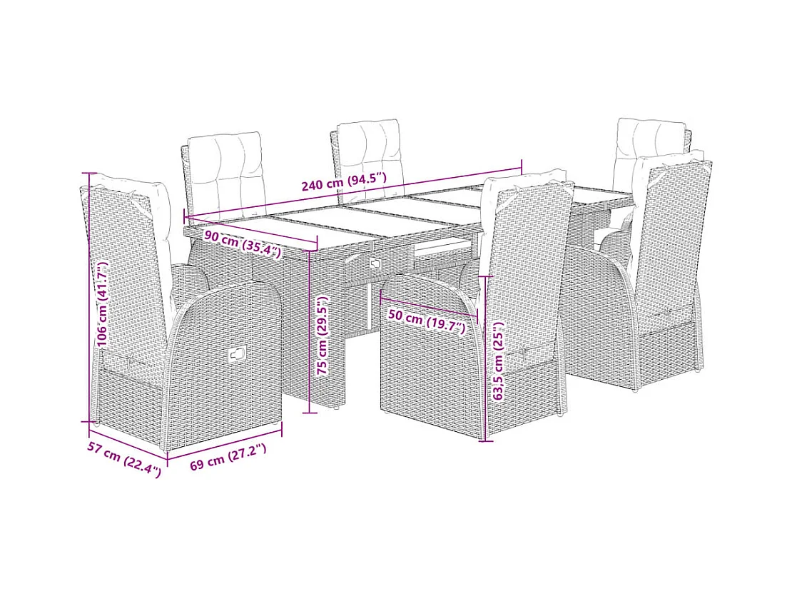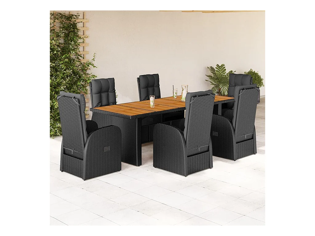 7 pcs conjunto de jantar p/ jardim c/ almofadões vime PE preto