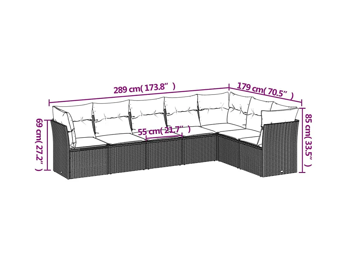 6 pcs conjunto de sofás jardim c/ almofadões vime PE castanho