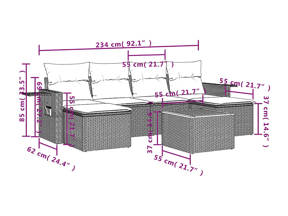 7 pcs conjunto de sofás p/ jardim c/ almofadões vime PE preto