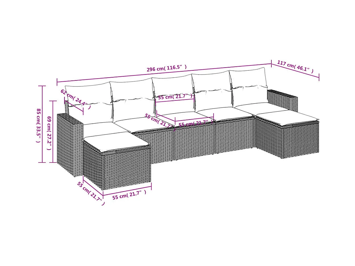 7 pcs conjunto de sofás p/ jardim c/ almofadões vime PE preto