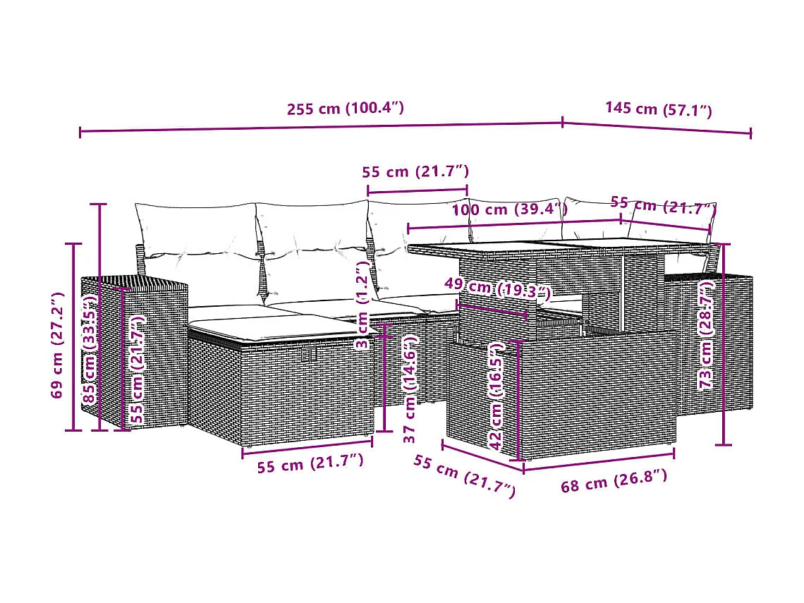 7 pcs conjunto de sofás p/ jardim com almofadões vime PE bege