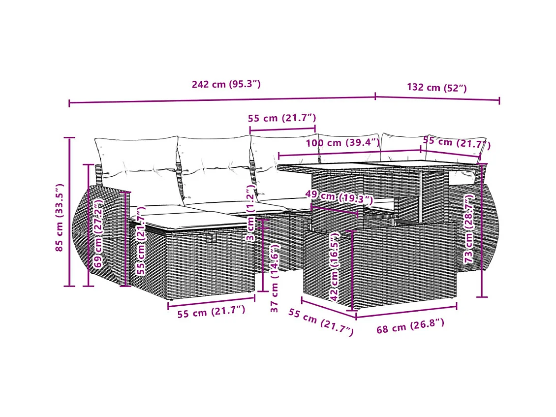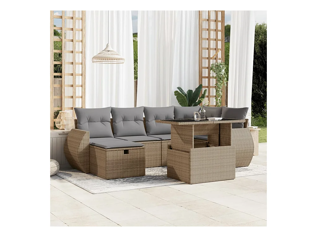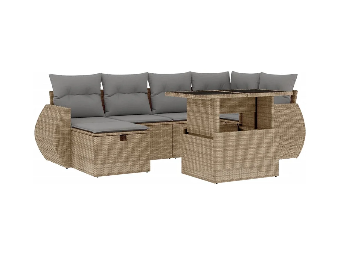 7 pcs conjunto de sofás p/ jardim com almofadões vime PE bege