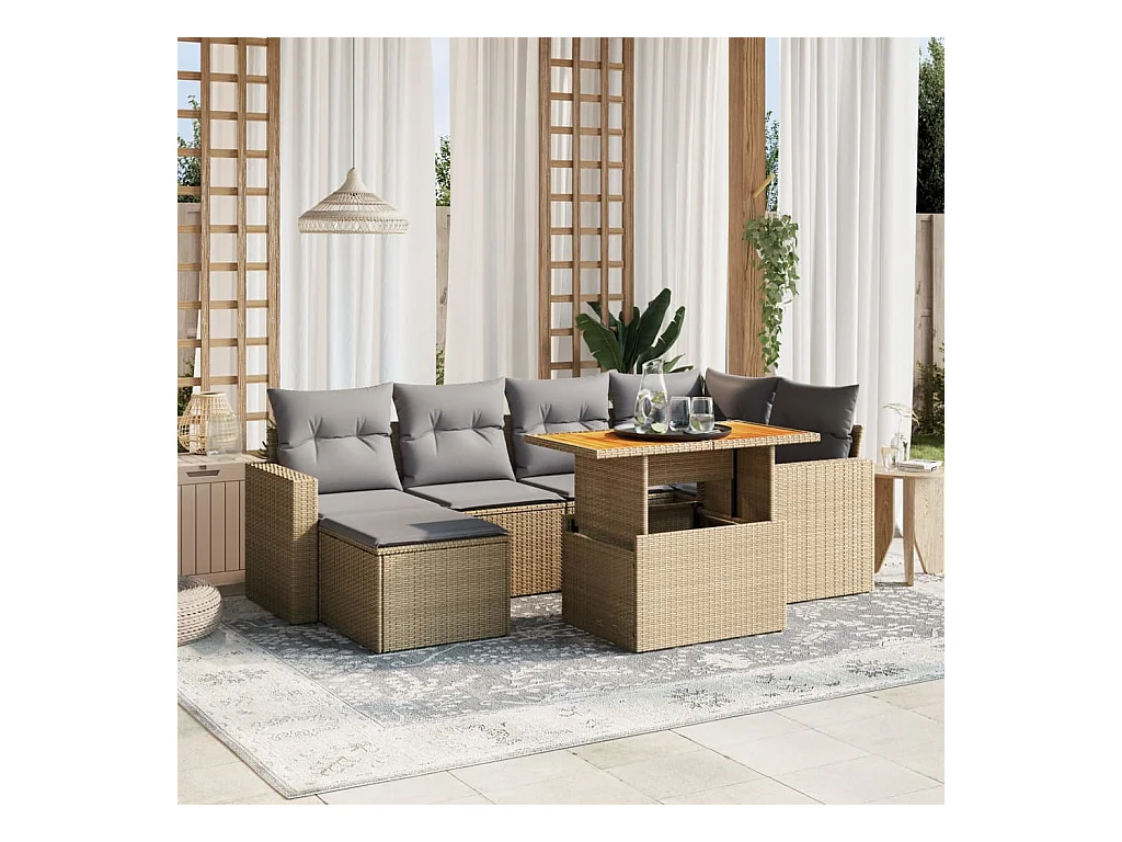 7 pcs conjunto sofás jardim com almofadões vime PE/acácia bege