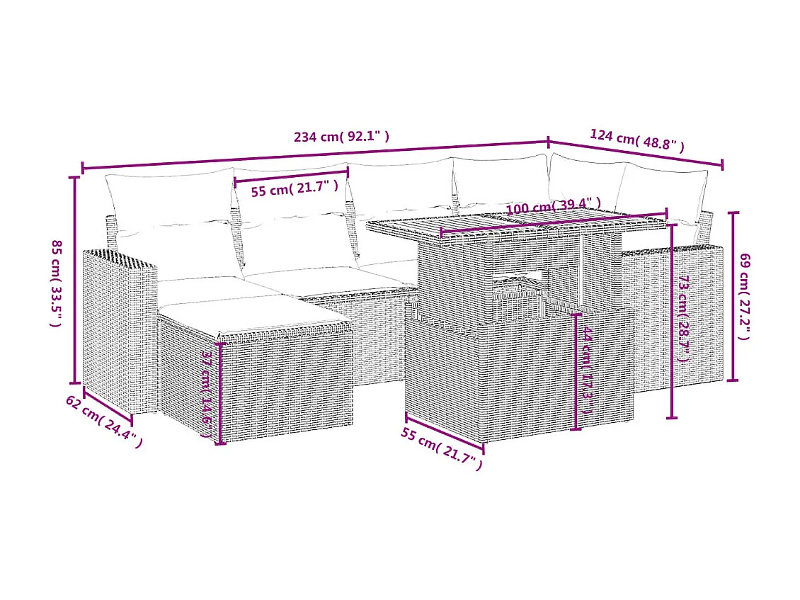 7 pcs conjunto de sofás p/ jardim com almofadões vime PE bege