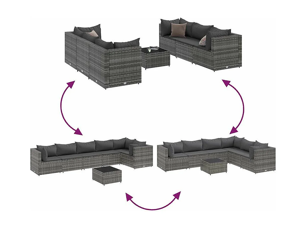 10 pcs conjunto sofás de jardim c/ almofadões vime PE cinzento