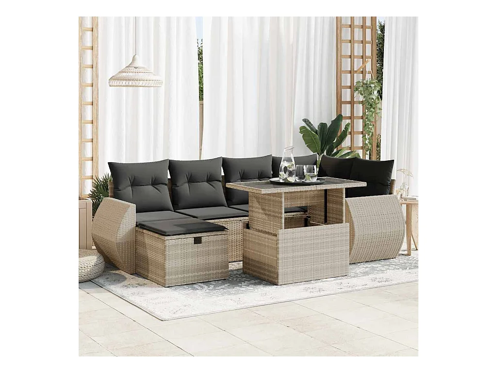 6 peças conj. sofás jardim com almofadões vime PE cinzento-claro