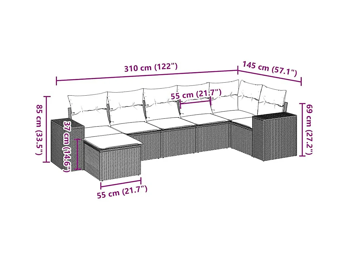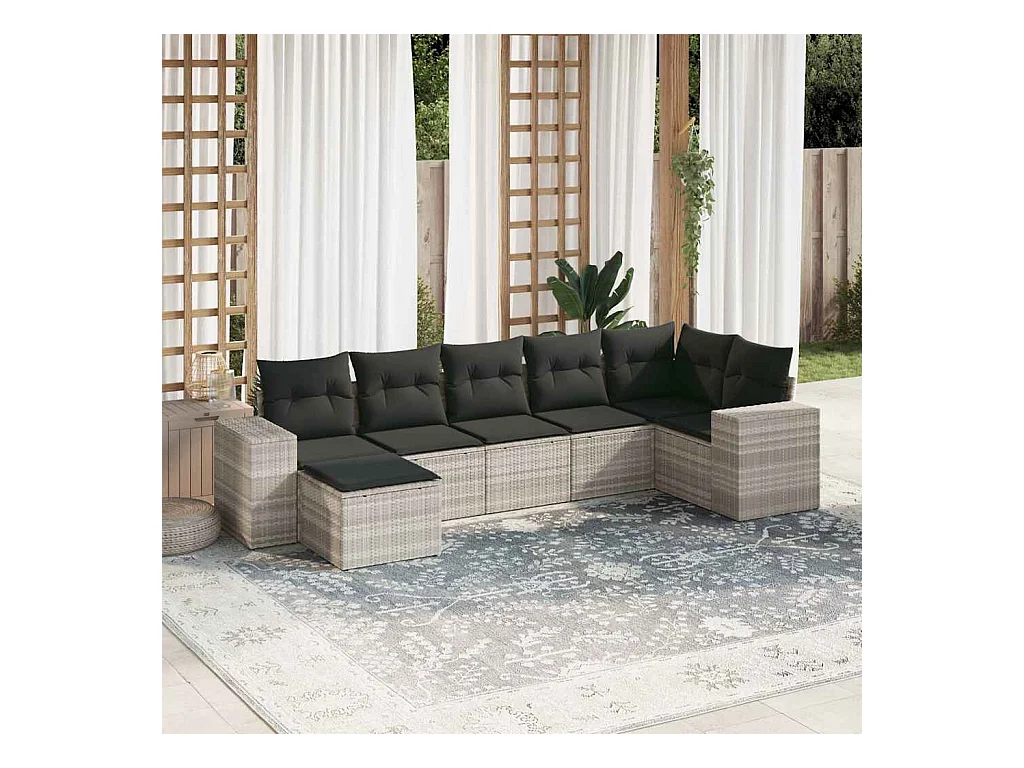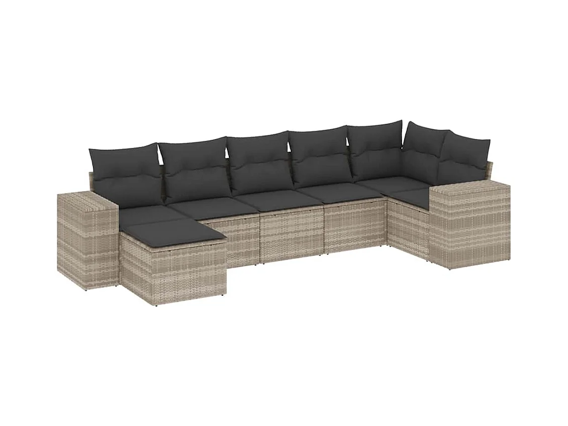 7 peças conj. sofás jardim com almofadões vime PE cinzento-claro