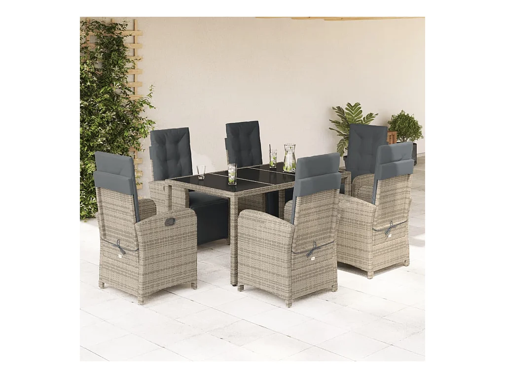 7 peças conj. jantar jardim + almofadões vime PE/vidro cinza claro