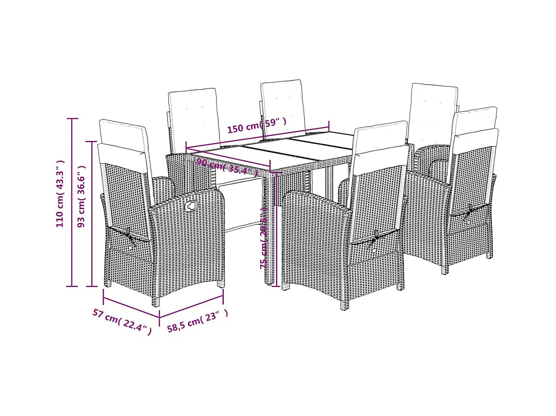 7 peças conjunto jantar jardim com almofadões vime PE/vidro cinza