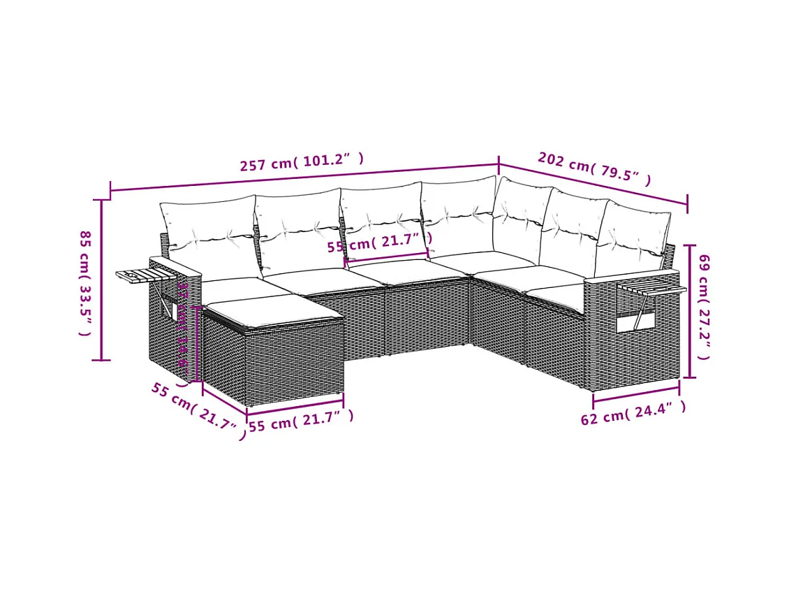 7 peças conjunto de sofás p/ jardim com almofadões vime PE bege