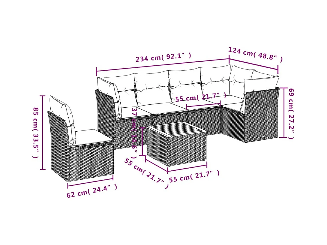 7 peças conjunto de sofás p/ jardim com almofadões vime PE bege