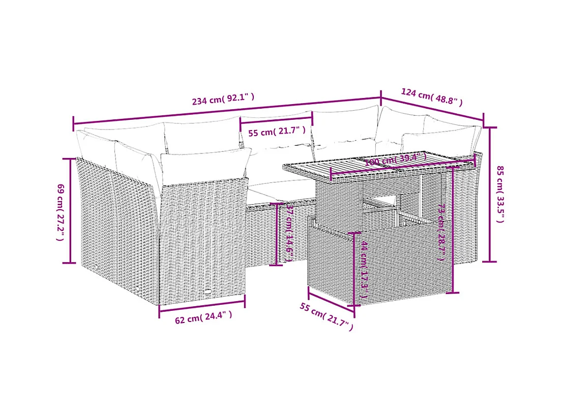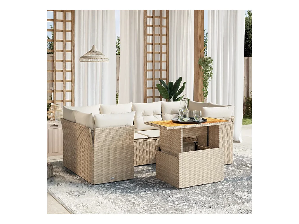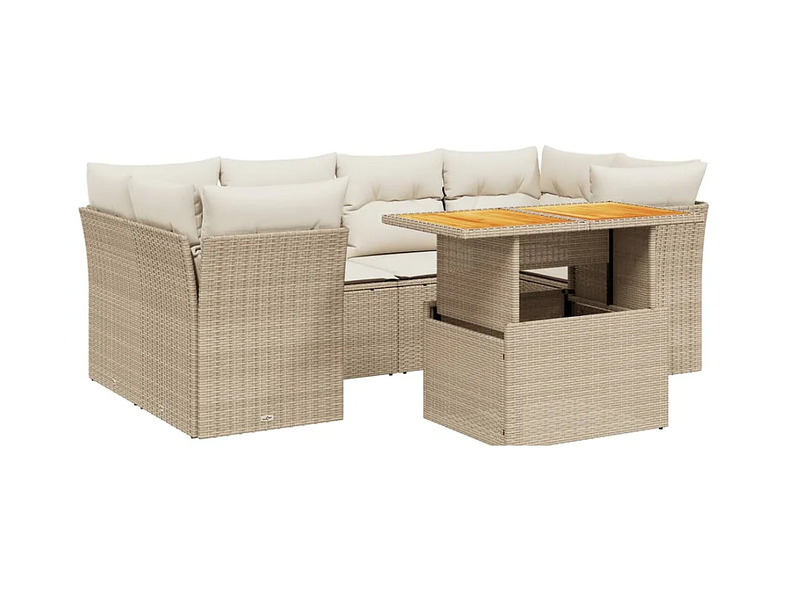 7 peças conjunto de sofás para jardim com almofadões vime PE bege