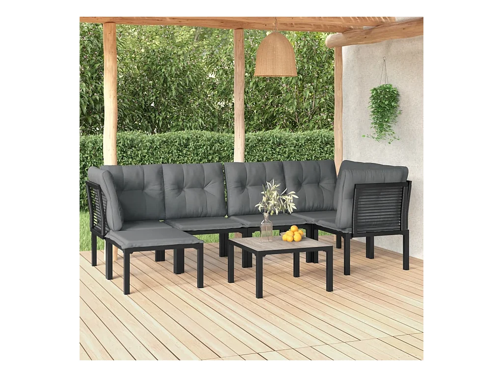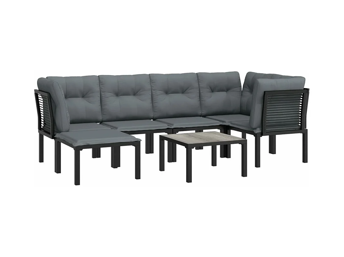 7 peças conjunto lounge de jardim vime PE preto e cinzento