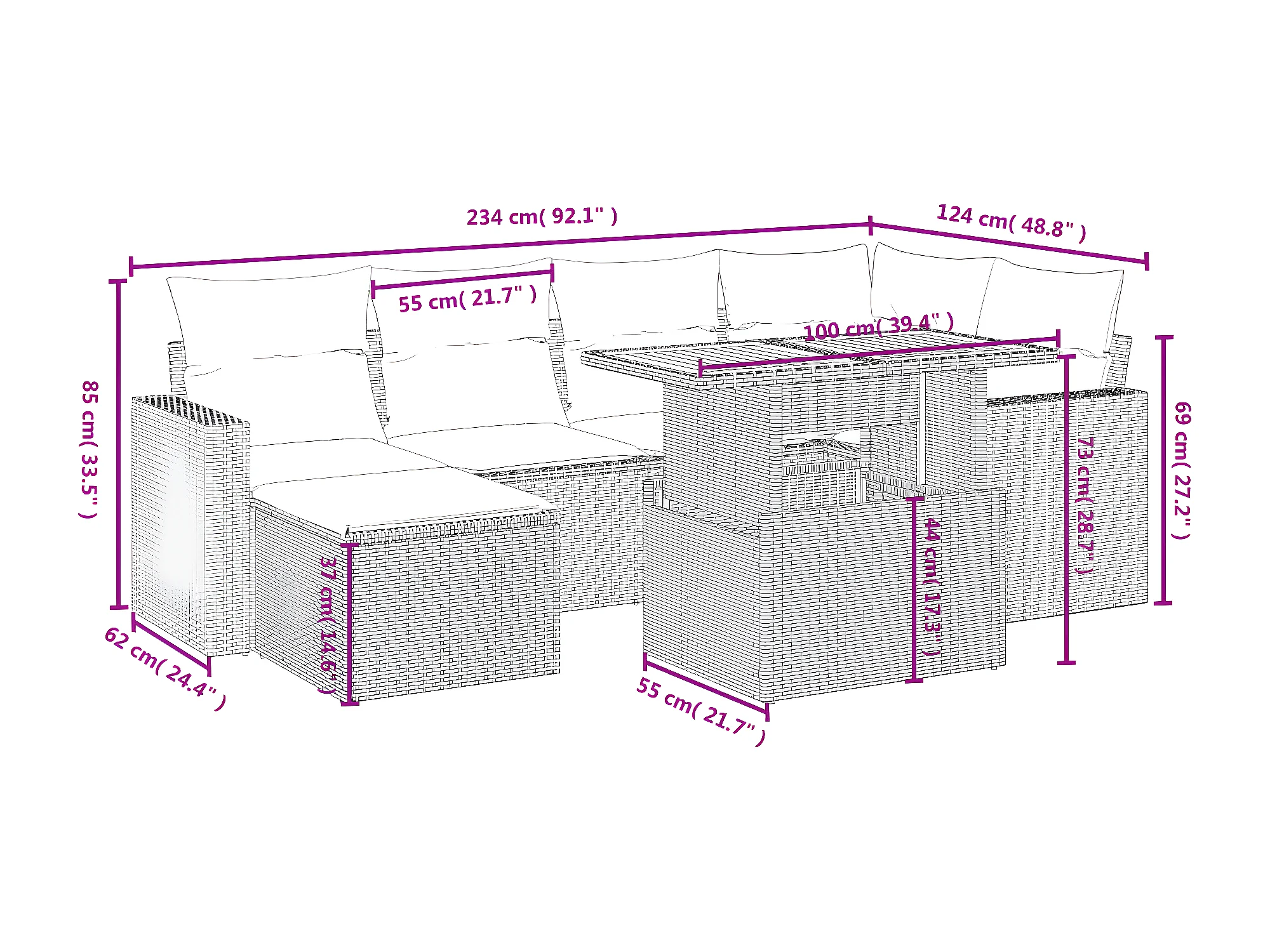 7 peças conjunto sofás p/ jardim c/ almofadões vime PE cinzento