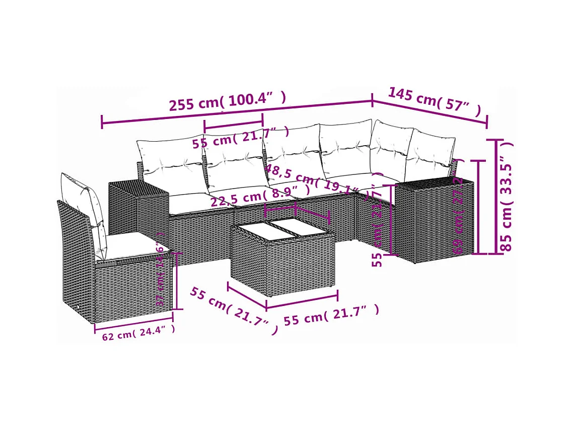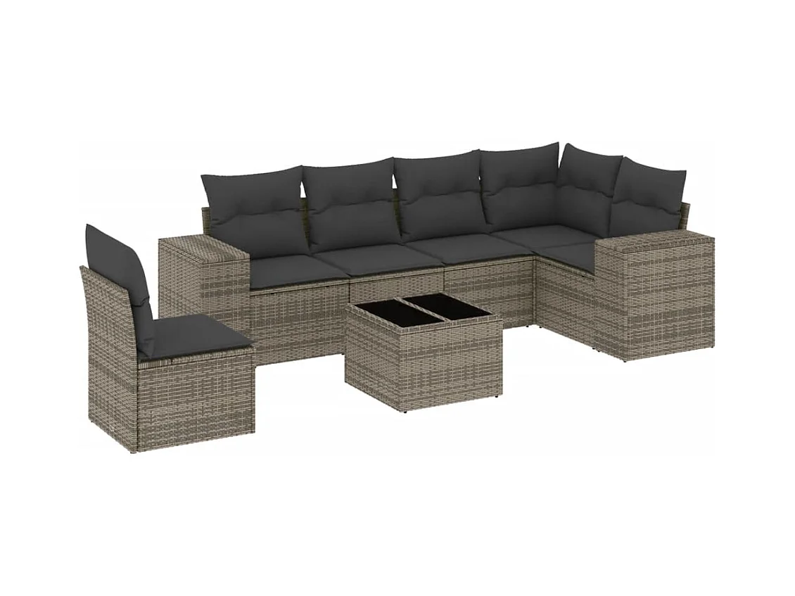 7 peças conjunto sofás para jardim com almofadões vime PE cinzento
