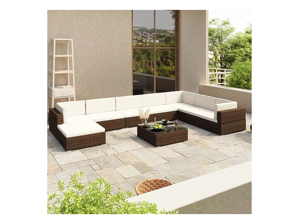 9 pcs conjunto jantar exterior c/ almofadões vime PE castanho